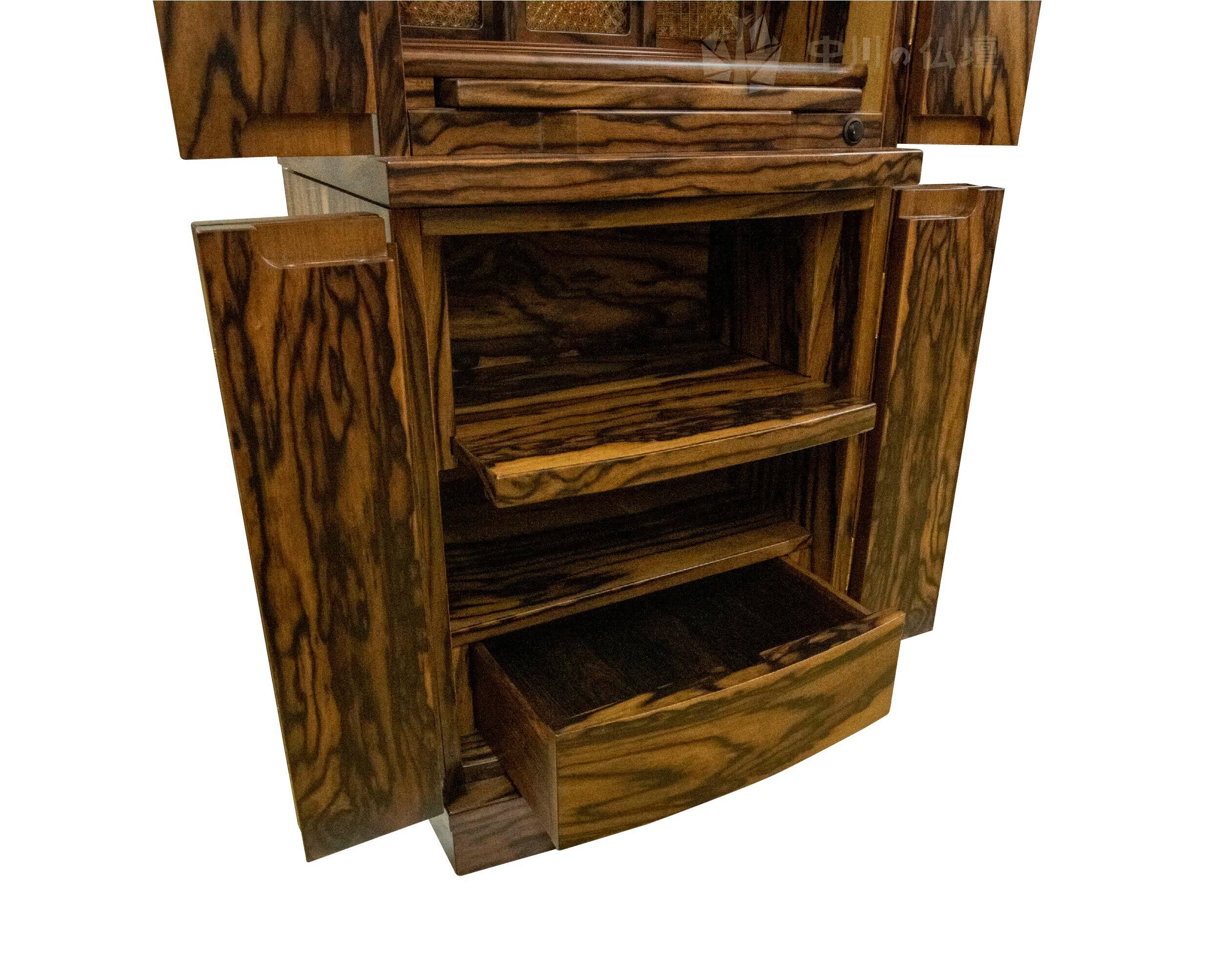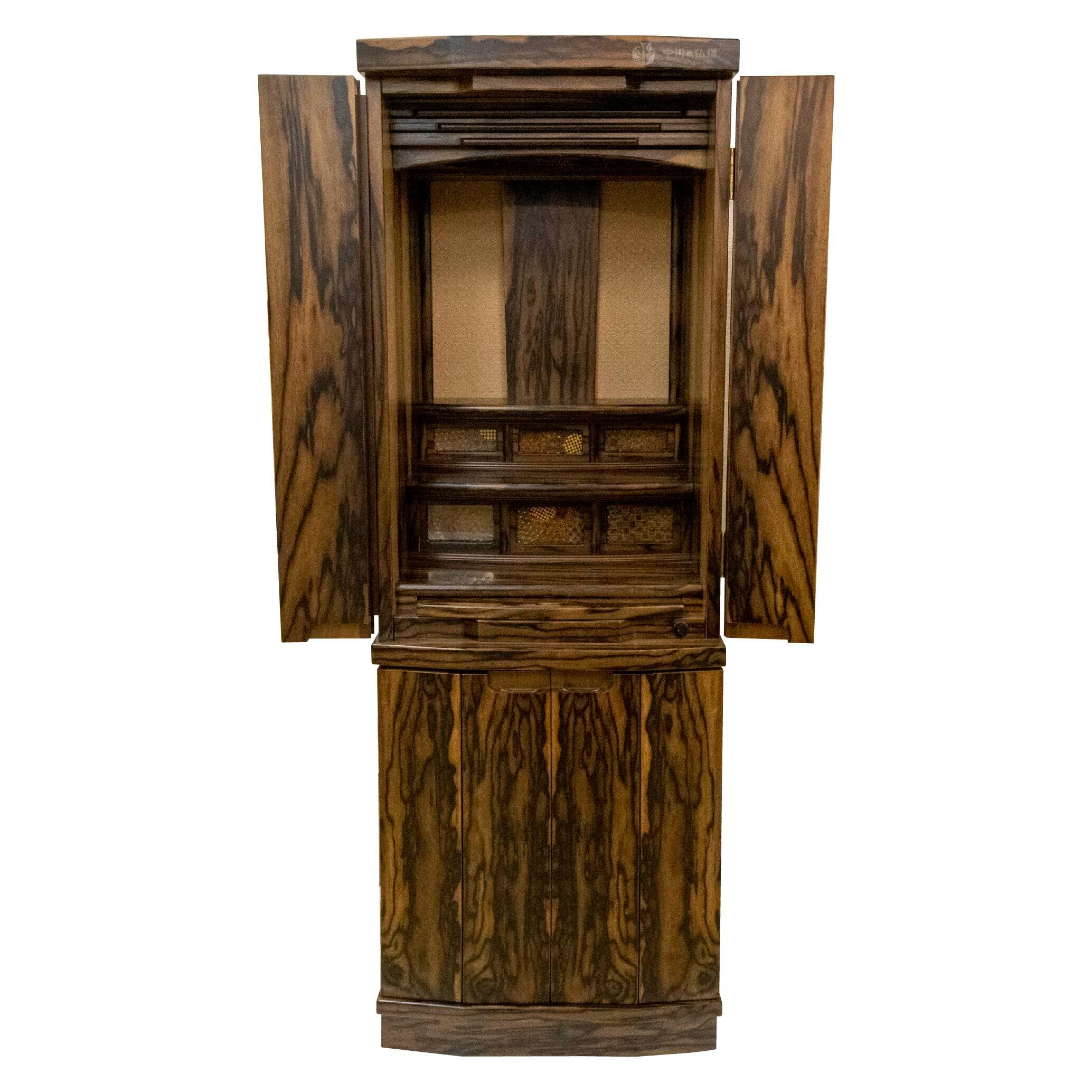 黒柿の仏壇です。シャム柿ではありません。木目に特徴があります。模様が妖艶で黒柿ならではの個性が光る逸品です。メーカーの限定商品です。貴重であり希少品です。 台輪・戸板:黒柿薄板貼 主心材:木質繊維板 塗装:ウレタン仕上げ LED:照明付 原産国 日本 幅48㎝ 奥行43㎝ 高さ140㎝